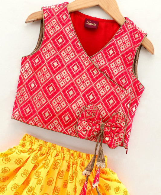 Twisha Girls Smart Bow And Tassles Details Top With Printed Dhoti- Red & Yellow