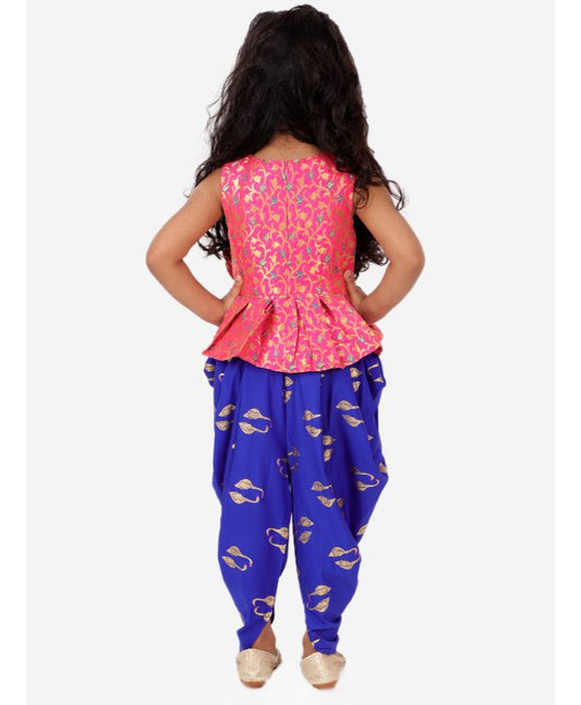 Twisha Girls Brocade with Bow Detail Top And Flamingo printed Dhoti Set-Pink And Blue