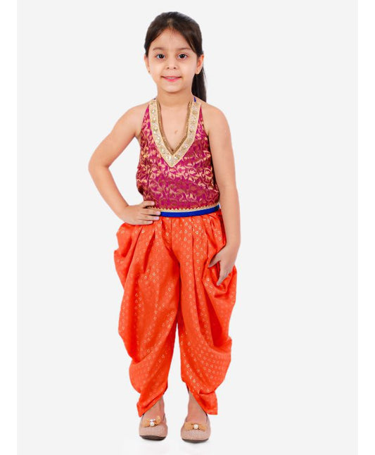 Twisha Girls Brocade with Emroidery Deatil Top And Printed Dhoti -Majenta And Orange