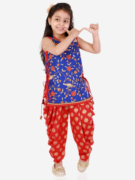 Girls Embroidered Kurti With Designer Dhoti-Blue & Red