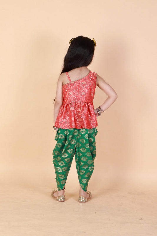 Twisha Girls Asymmetric Elephant Design Top With Printed Dhoti- Red & Green