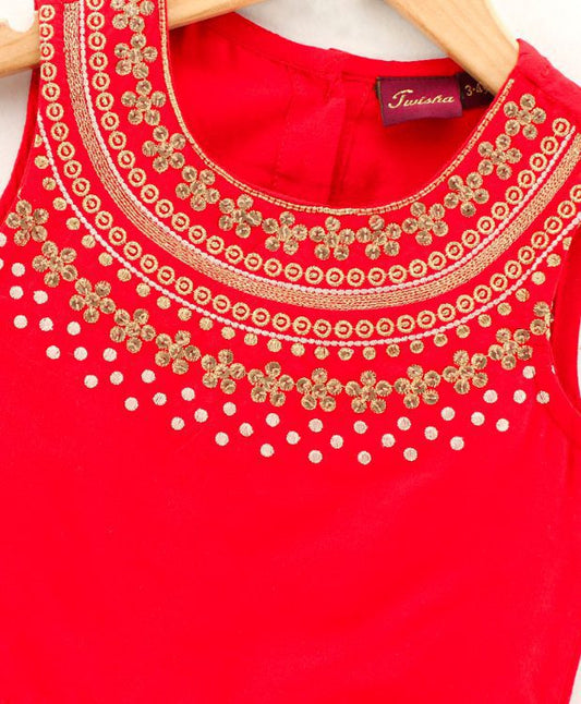Twisha Girls Embroidered top with printed Dhoti-Red And Yellow