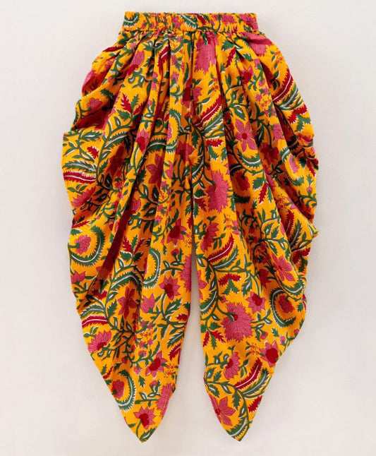 Twisha Girls printed top with potli button details and printed Dhoti-Red And Yellow