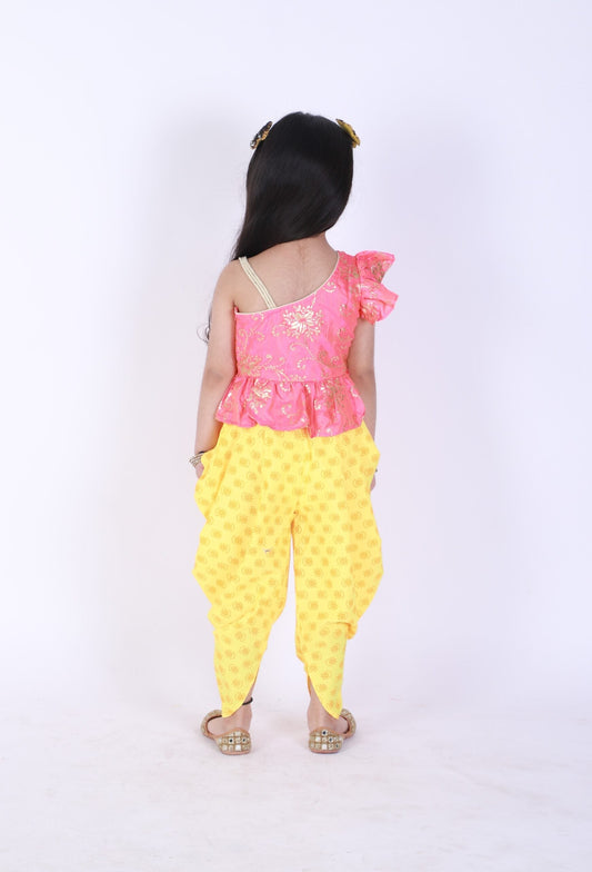 Twisha Girls Brocade with Frill Detail Top And Dhoti Set-Pink And Yellow