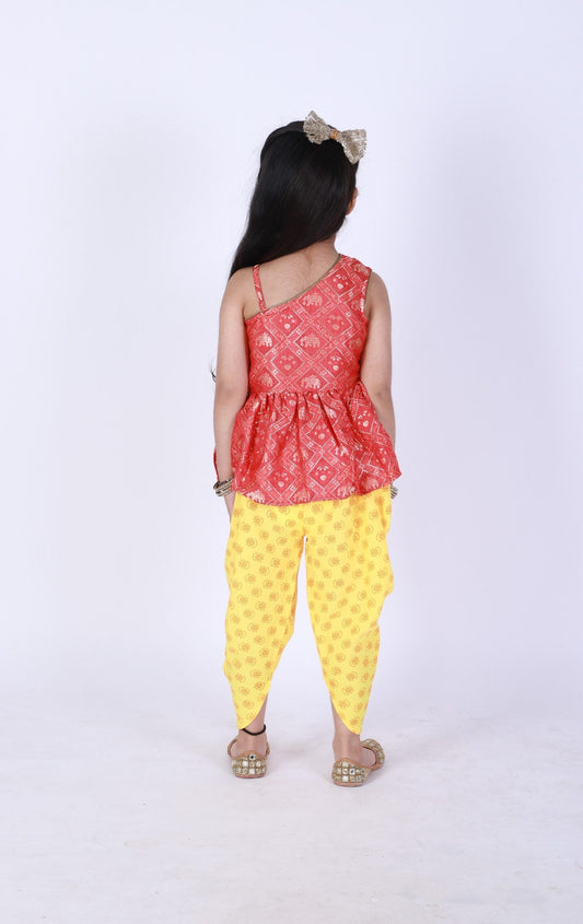 Twisha Girls Asymmetric Elephant Design Top With Printed Dhoti- Red & Yellow