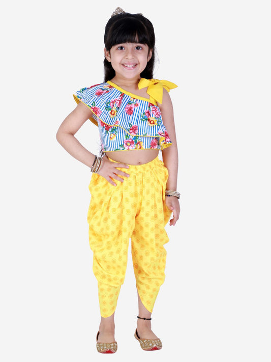 Twisha Girls Printed One Shoulder Top With Printed Dhoti - White & Yellow