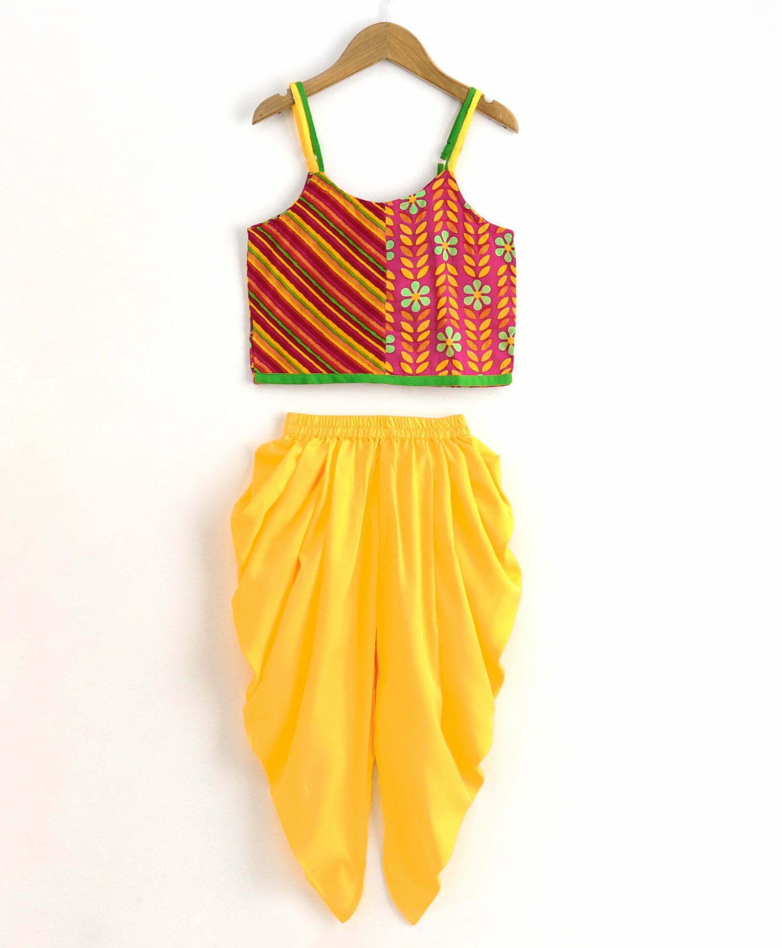 Girls Half And Half Top With Dhoti Set-Pink Yellow