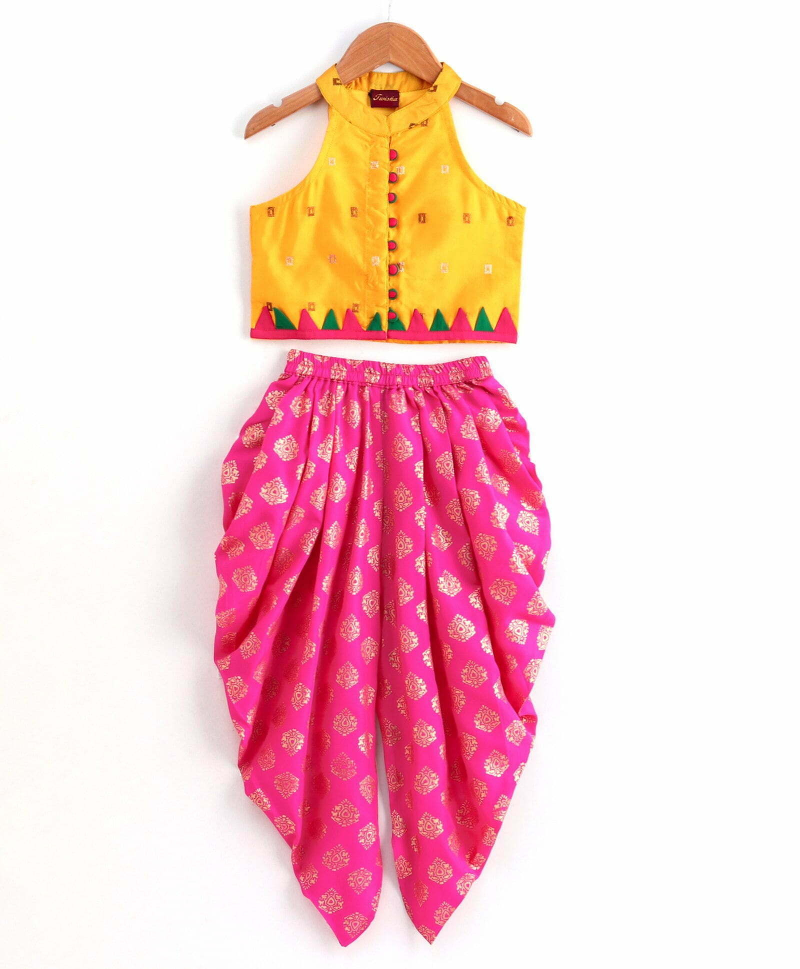 Girls Incut Top With Dhoti Set Pink & Yellow