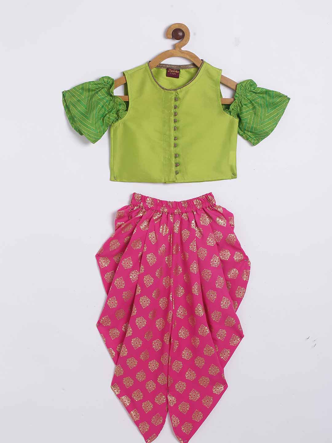 Girls Printed Top & Designer Dhoti - Green & Pink