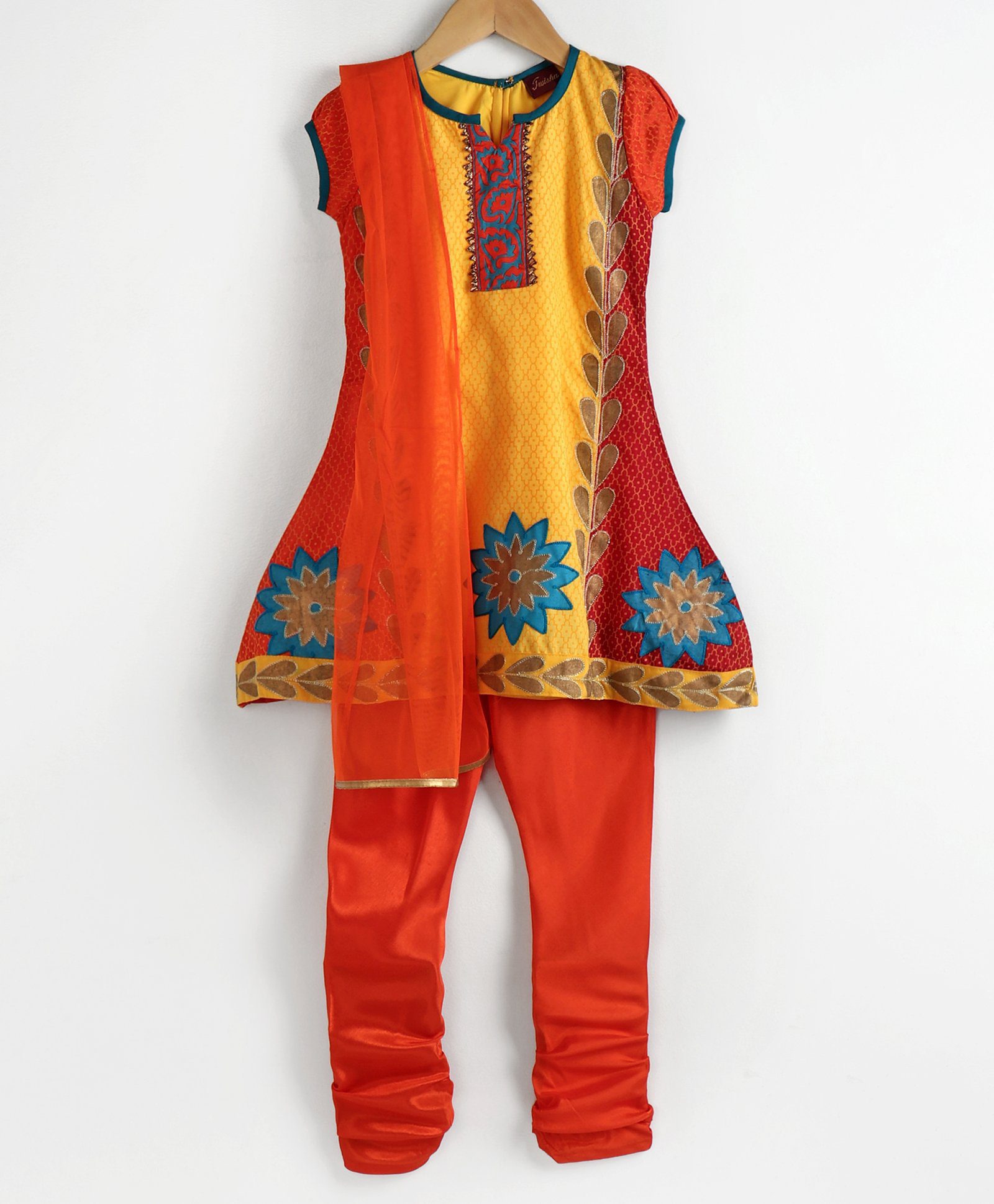 Girls Trendy And Fashionable Color Block Kurta & Churidar With Dupatta- Mustard & Orange