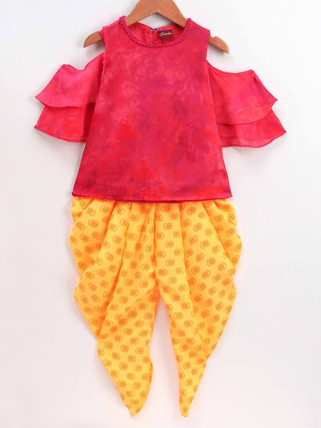 Printed Cold Shoulder Half Sleeves Top With Dhoti - Pink & Yellow