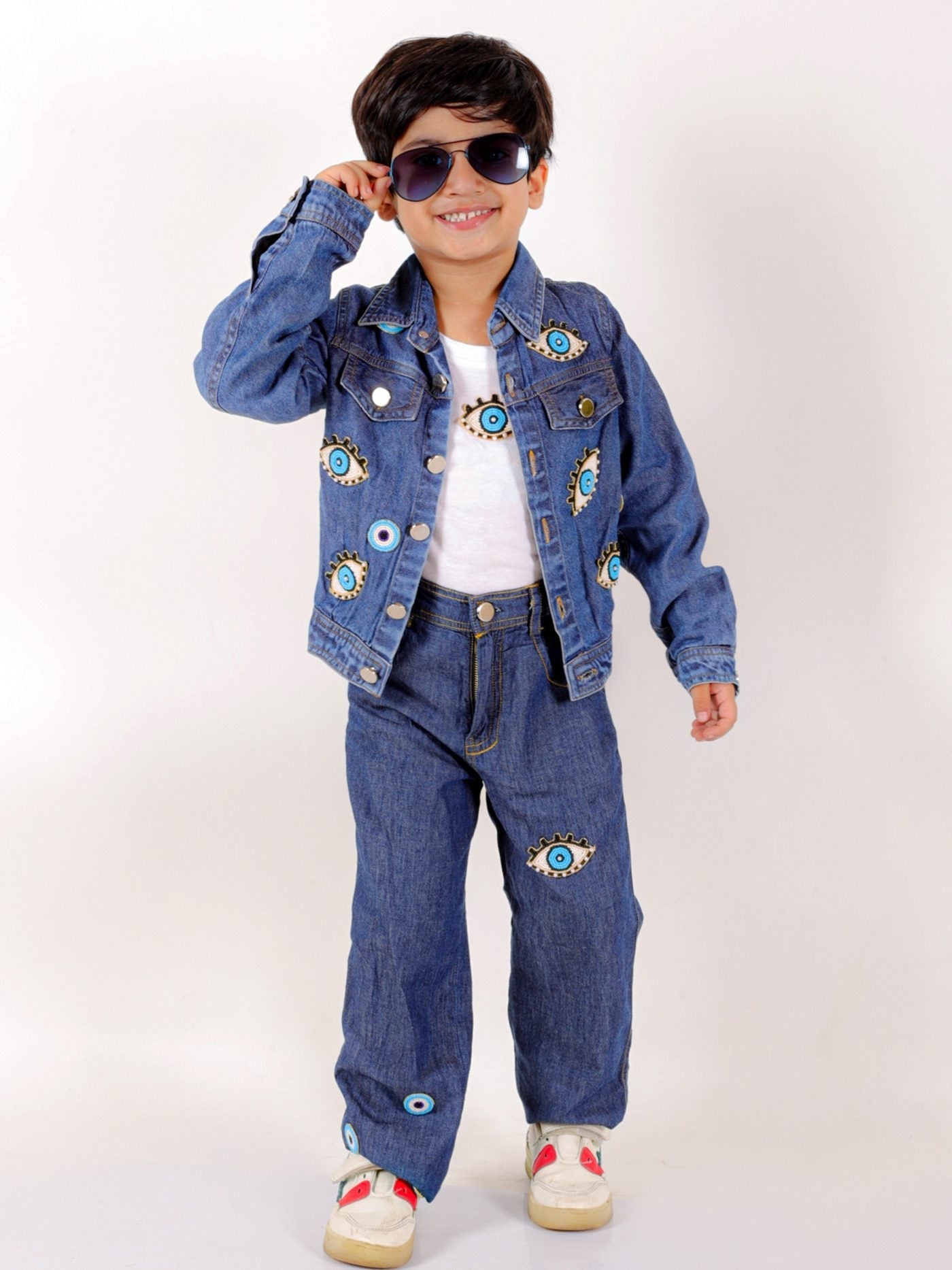 Twisha Boys Long Sleeves Denim Jacket & Jeans Embellished With Evil Eye Appliques - Blue