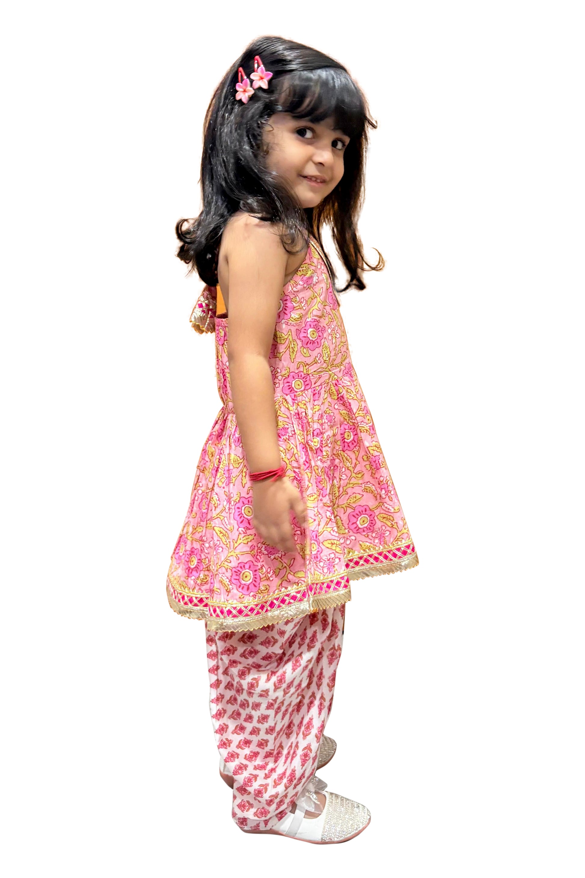 Twisha Cotton Fullsleeves All Over Printed Kurta with Dhoti - Peach & White