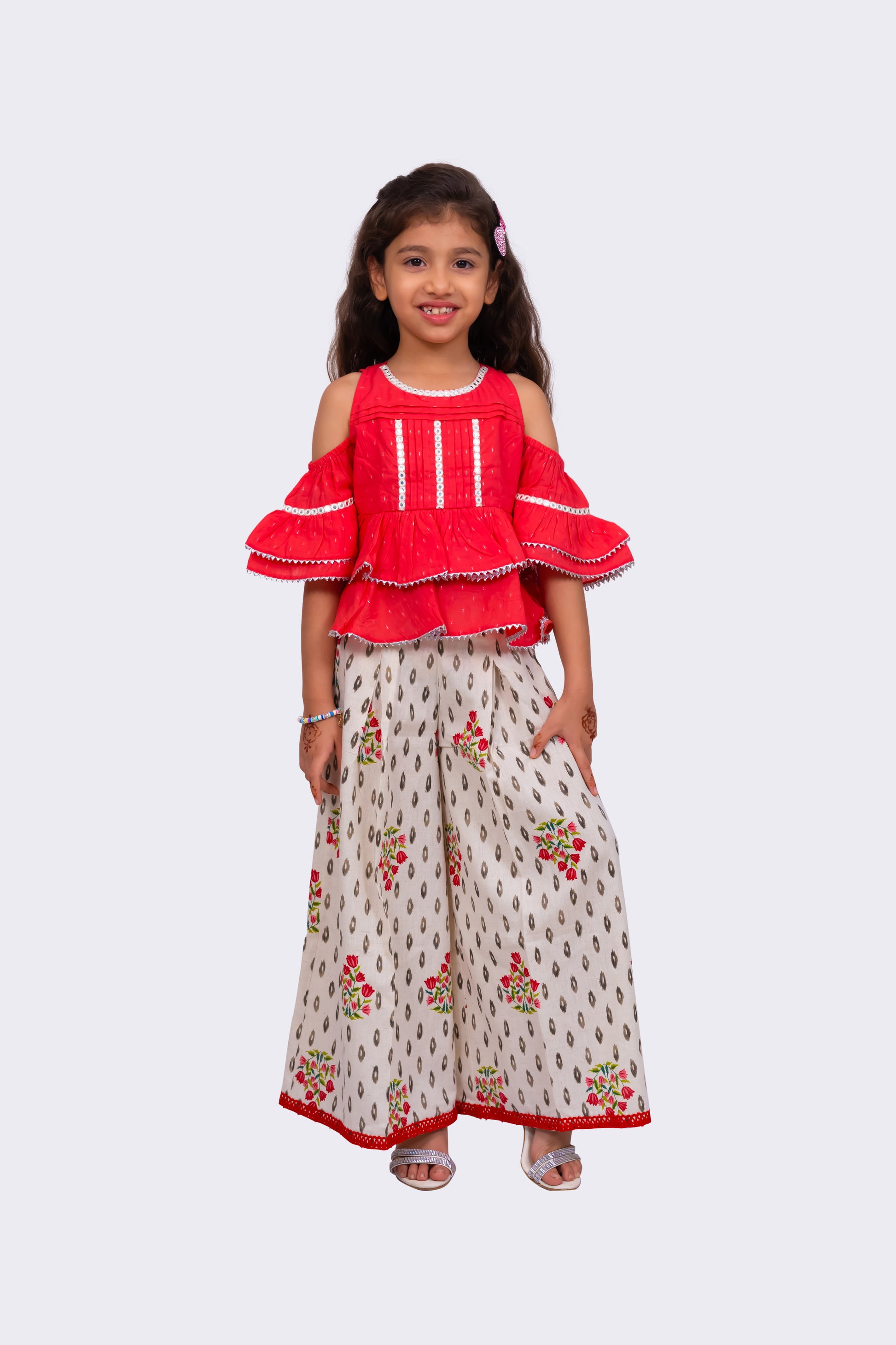 Twisha Girls Cold Sleeve Cotton Top With Printed Sharara - Coral & White