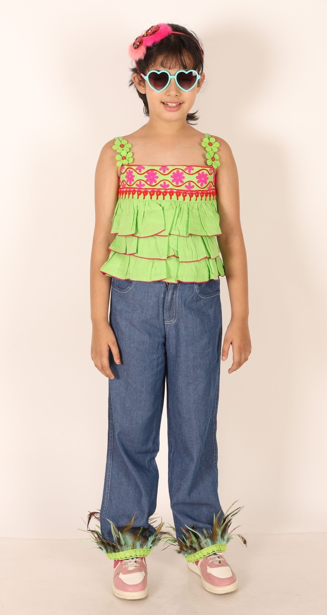 Twisha Girls Embroidered Frilled Top & Embellished With Feathers Lace Jeans - Lime Green & Blue