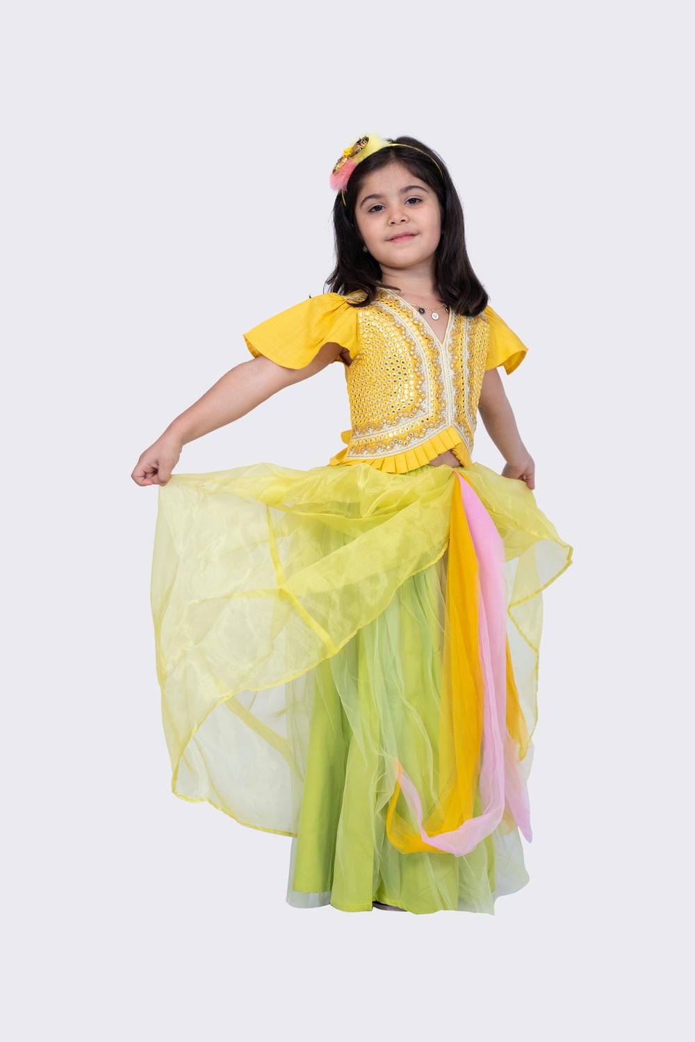 Twisha Girl's Frilled Sleeves Mirror Embellished Top and Draped Ghagra- Mustar & Lime Green