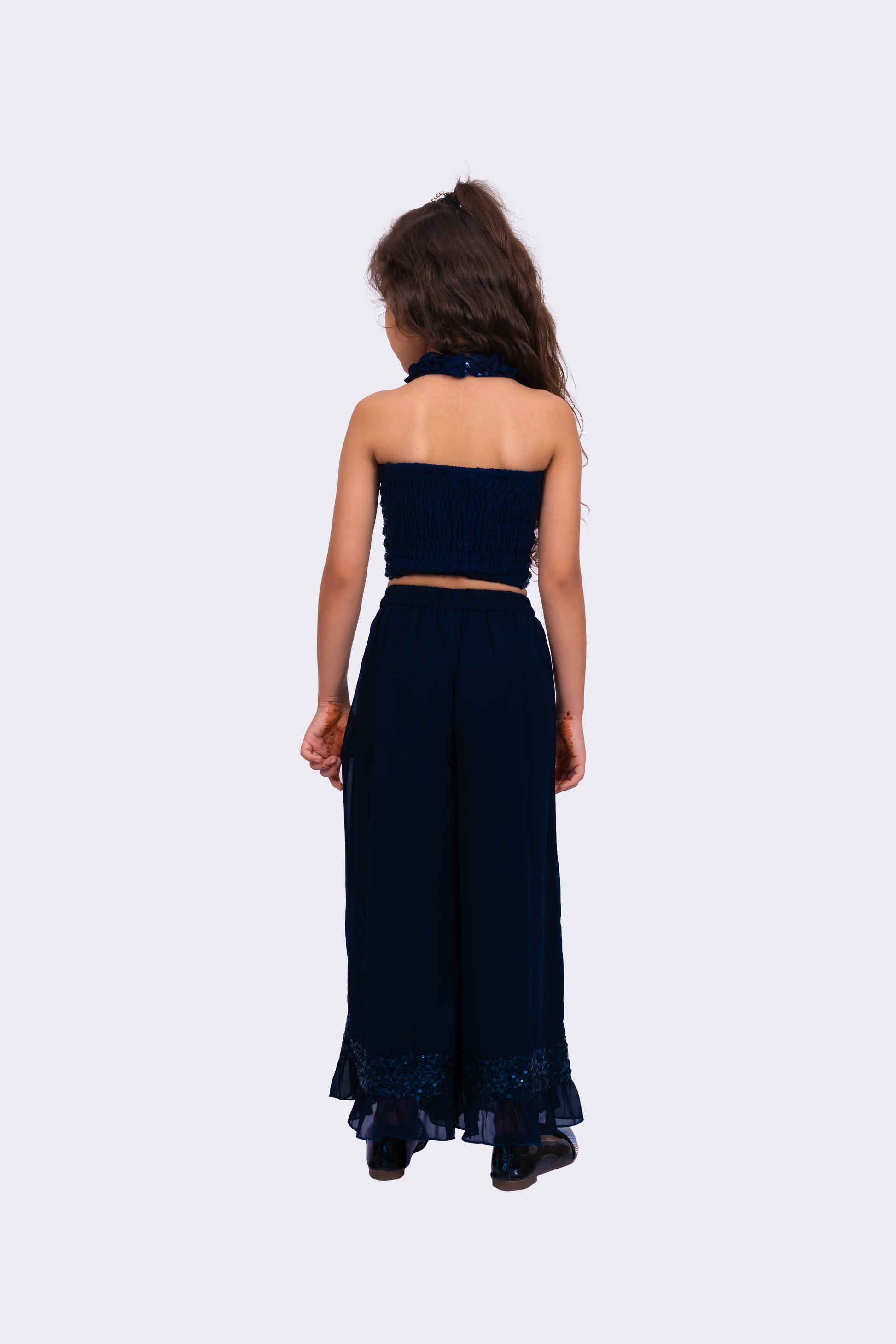 Twisha Girls Sleeveless Halter Neck Embellished Top With Palazzo - Navy Blue