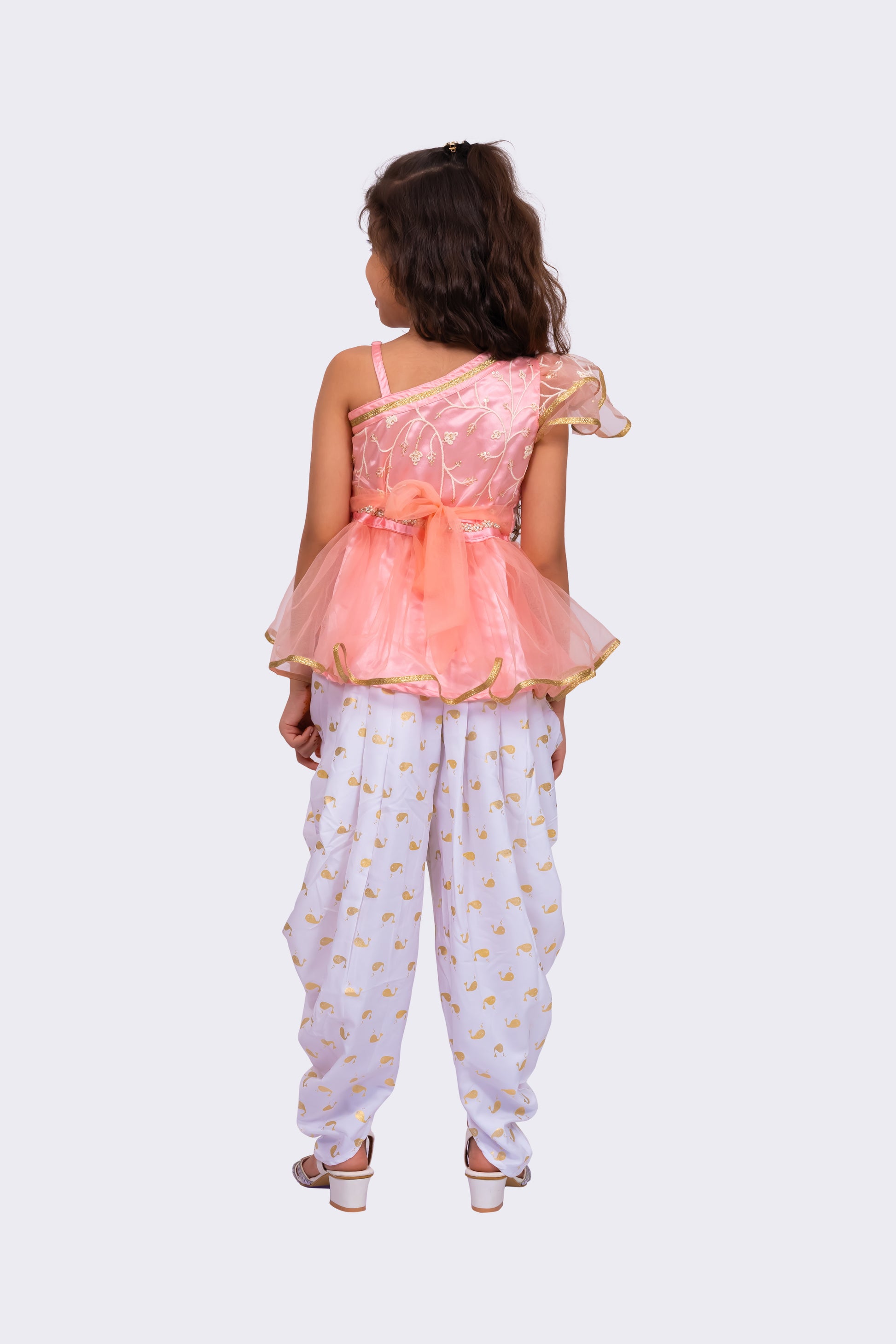 Twisha Girls Sleeveless Polyester One Shoulder Embellished Top With Dhoti - Peach & White