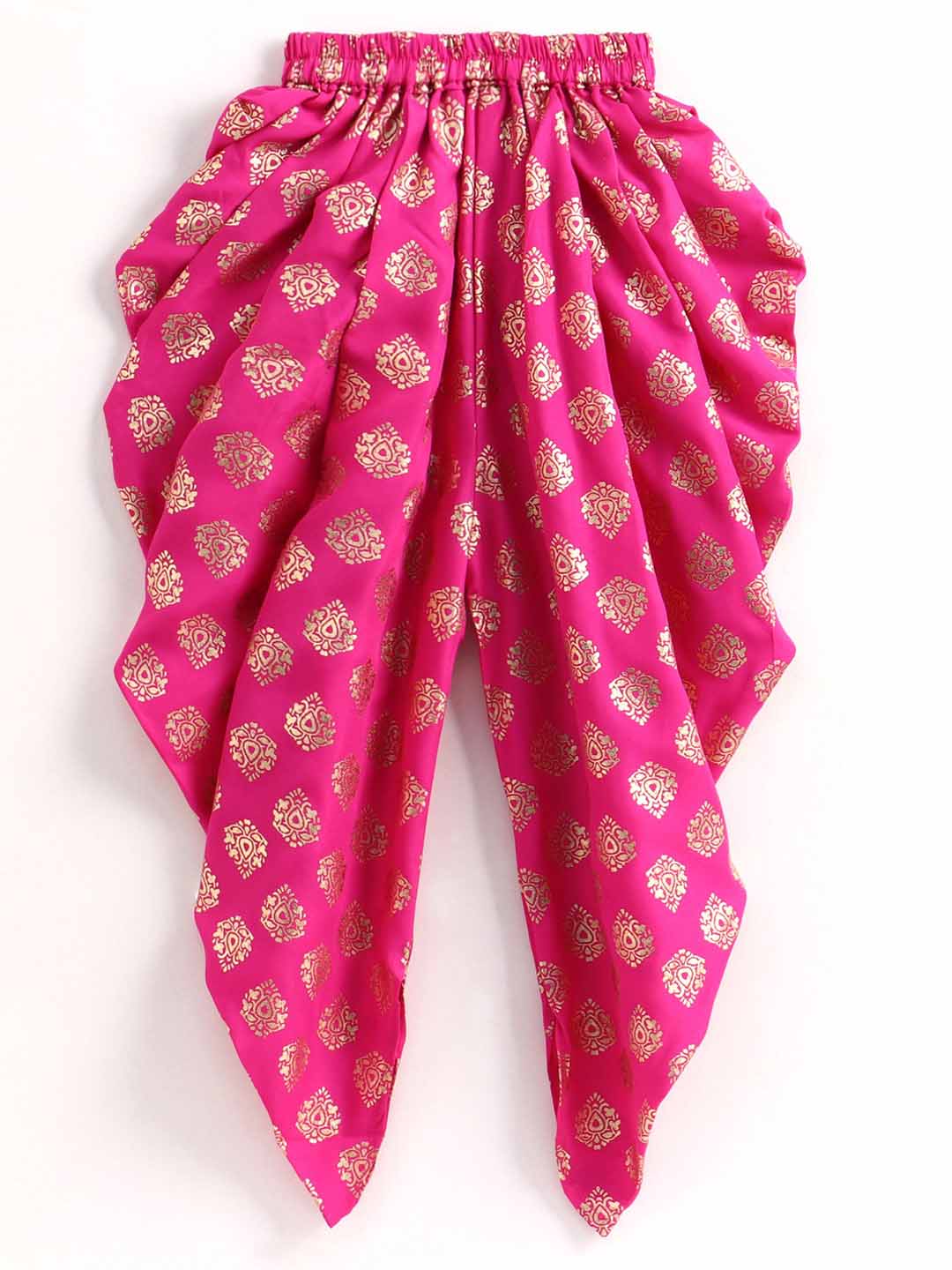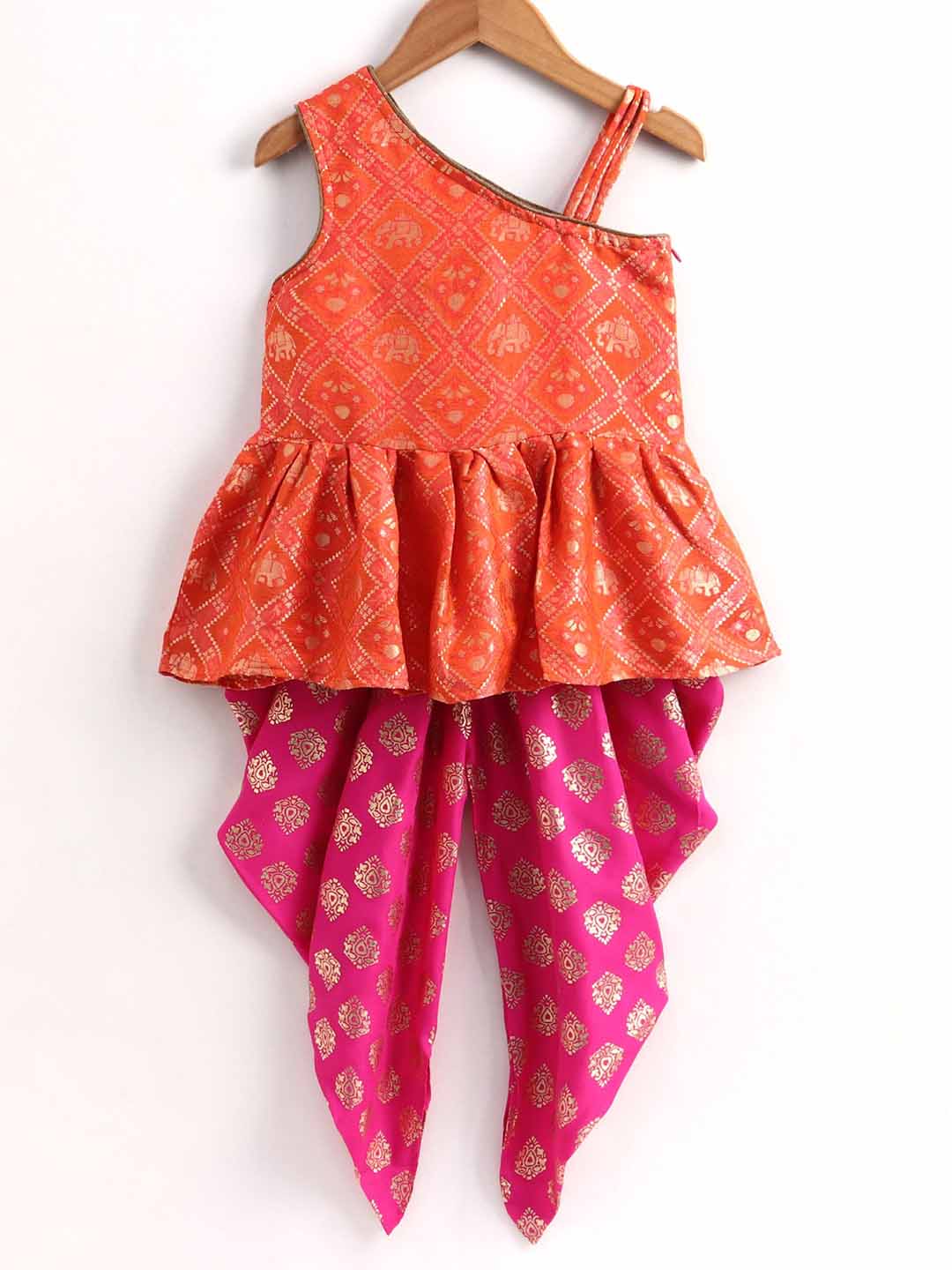 Twisha Sleeveless Brocade Asymmetrical Neck Top With Dhoti- Orange & Pink